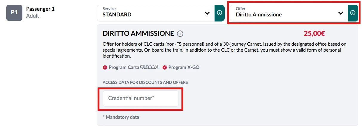 When booking, you must first select a connection via the journey planner. Then, in the ticket selection, you can choose the DIRITTO AMMISSIONE fare via the Show more offers button. You can enter the number of your FIP Coupon as the access number.