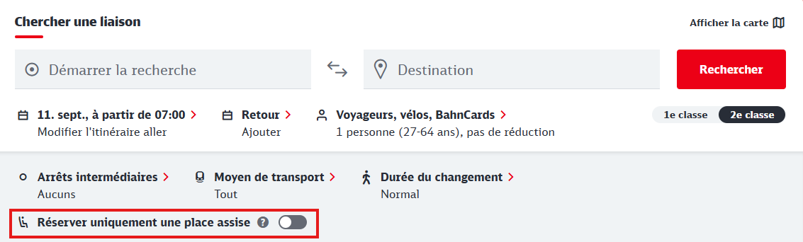 Les réservations de sièges peuvent être effectuées via le site web de la Deutsche Bahn. Pour cela, sélectionnez l’option « Réserver uniquement une place assise » dans la recherche.
